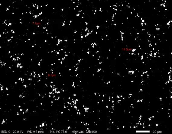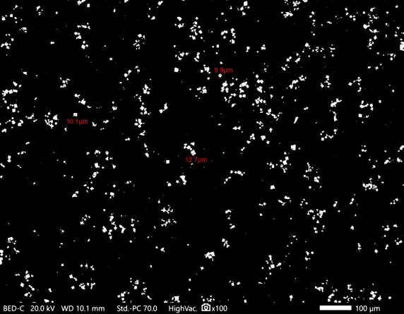 1. Door snelkoelend gieten krijgt het product een uniforme samenstelling. De Al3Sc-deeltjes zijn verspreid zonder agglomeratie en hun grootte is minder dan 20 μm.